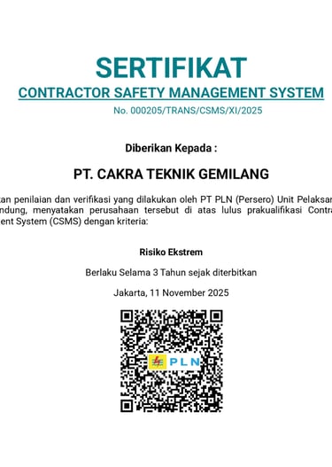 Sertifikasi ini membuktikan komitmen kami dalam menjaga kualitas, profesionalisme, dan kepatuhan terhadap standar yang berlaku. Dengan pencapaian ini, kami memastikan kepercayaan dan kepuasan pelanggan serta mitra bisnis tetap menjadi prioritas utama.