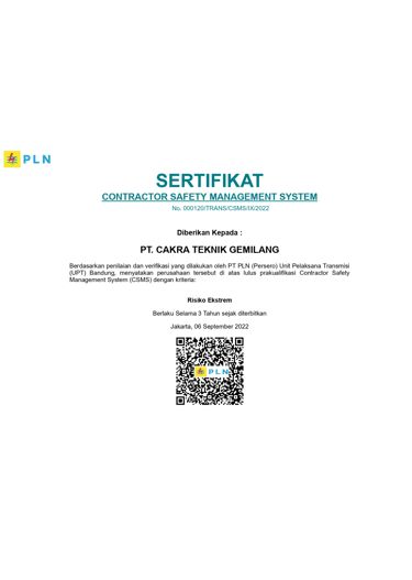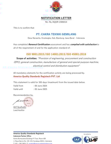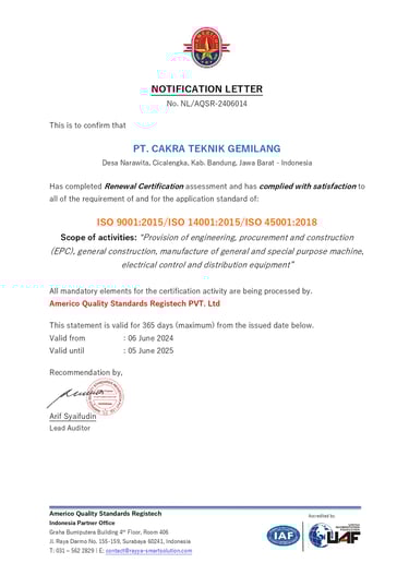 Sertifikasi ini membuktikan komitmen kami dalam menjaga kualitas, profesionalisme, dan kepatuhan terhadap standar yang berlaku. Dengan pencapaian ini, kami memastikan kepercayaan dan kepuasan pelanggan serta mitra bisnis tetap menjadi prioritas utama.